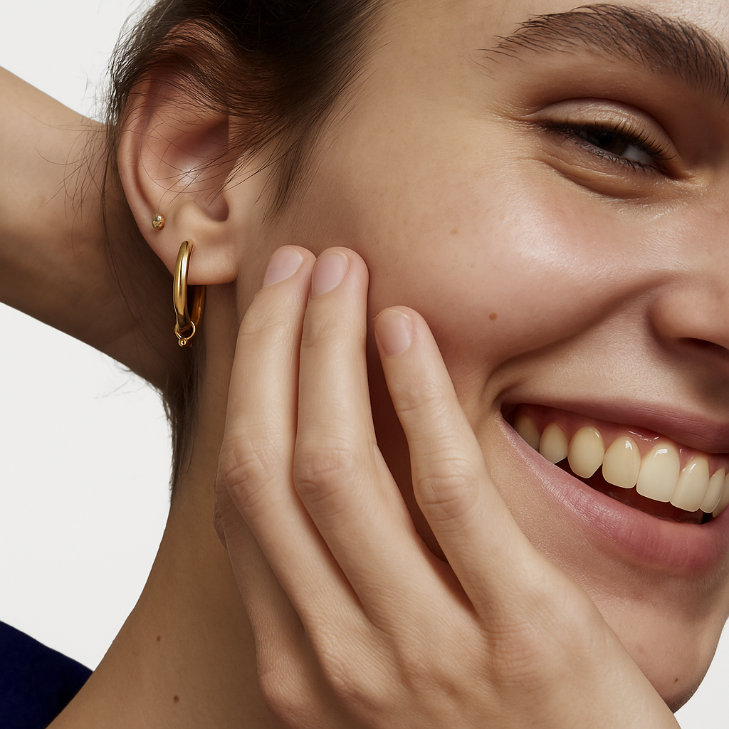 Piezas atemporales en acero inoxidable hipoalergénico y baño en oro 18K, diseñadas para acompañarte cada día. Minimalistas, versátiles y resistentes; joyas pensadas para combinar entre sí y elevar tu estilo sin esfuerzo. Evitar contacto con perfume, crema o agua salada. Limpiar con paño suave. Guardar en su estuche para preservar brillo y color. NOHOLAB — Joyas para cada día.