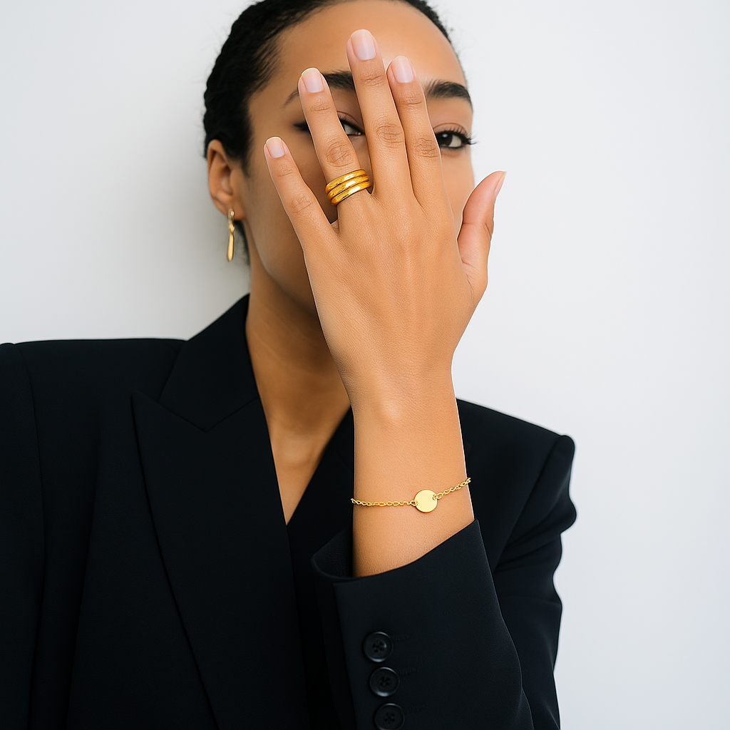 Piezas atemporales en acero inoxidable hipoalergénico y baño en oro 18K, diseñadas para acompañarte cada día. Minimalistas, versátiles y resistentes; joyas pensadas para combinar entre sí y elevar tu estilo sin esfuerzo. Evitar contacto con perfume, crema o agua salada. Limpiar con paño suave. Guardar en su estuche para preservar brillo y color. NOHOLAB — Joyas para cada día.